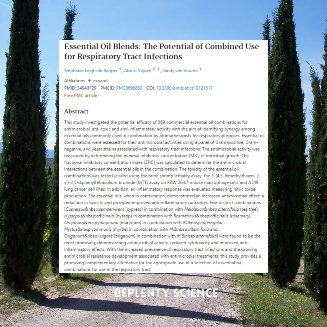 Bu çalışmada, solunum yolu patojenlerine karşı Cupressus sempervirens (selvi) uçucu yağı farklı uçucu yağlar ile birlikte ve çeşitli kombinasyonlarıyla akciğer hücre hatları üzerindeki anti-inflamatuar ve sitotoksik etkileri bildirmiştir. Bulgulara dayanarak, antimikrobiyal, sitotoksik ve antiinflamatuar etkilere dayalı olarak solunum yolu için kullanılabilcek farklı uçucu yağ kombinasyonları belirlenmiştir.